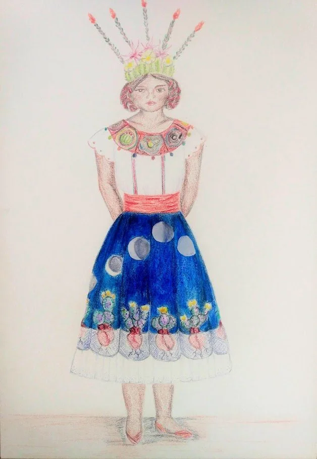 La Diosa de Corazones: Class project in which I designed a character based on a playing card. I drew the nine of hearts.